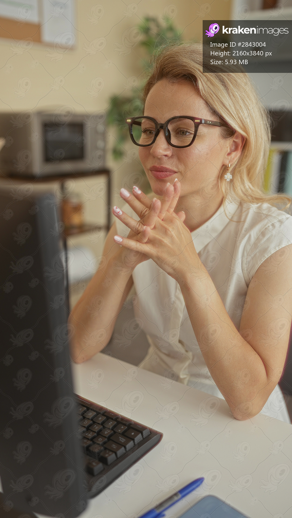 Woman with blonde hair and glasses clasping hands on keyboard at computer desk in building; concentration.