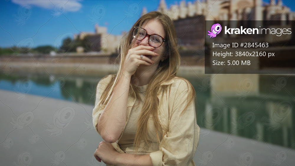 Woman with blonde hair and glasses covers mouth with hand for silence at building facade by water; shyness playfulness.