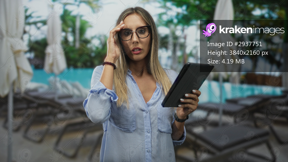 Woman with blonde hair and glasses holding a tablet, touching forehead and reading the screen beside turquoise pool loungers and closed umbrellas in building; concern. - Kraken Images