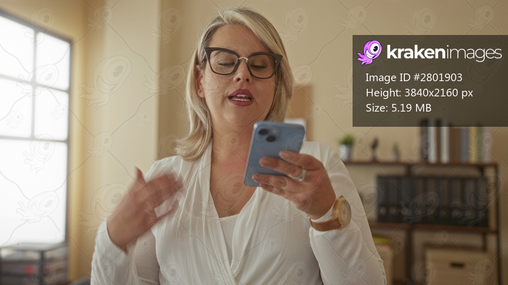 Woman with blonde hair and glasses holds smartphone with open palm in office interior, wearing white blouse and wristwatch while standing at desk; concentration focus professionalism. - Kraken Images