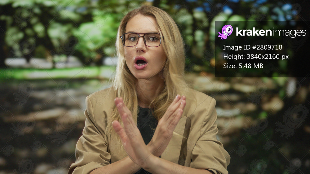 Woman with blonde hair and glasses in a park makes an x gesture with her arms in a green outdoor setting.