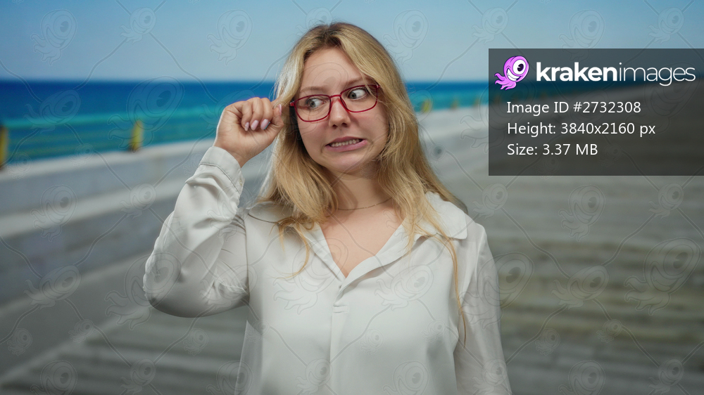 Woman with blonde hair and glasses making playful gestures on a sunny promenade by the blue sea, wearing white, evoking a relaxed and joyful seaside atmosphere. - Kraken Images