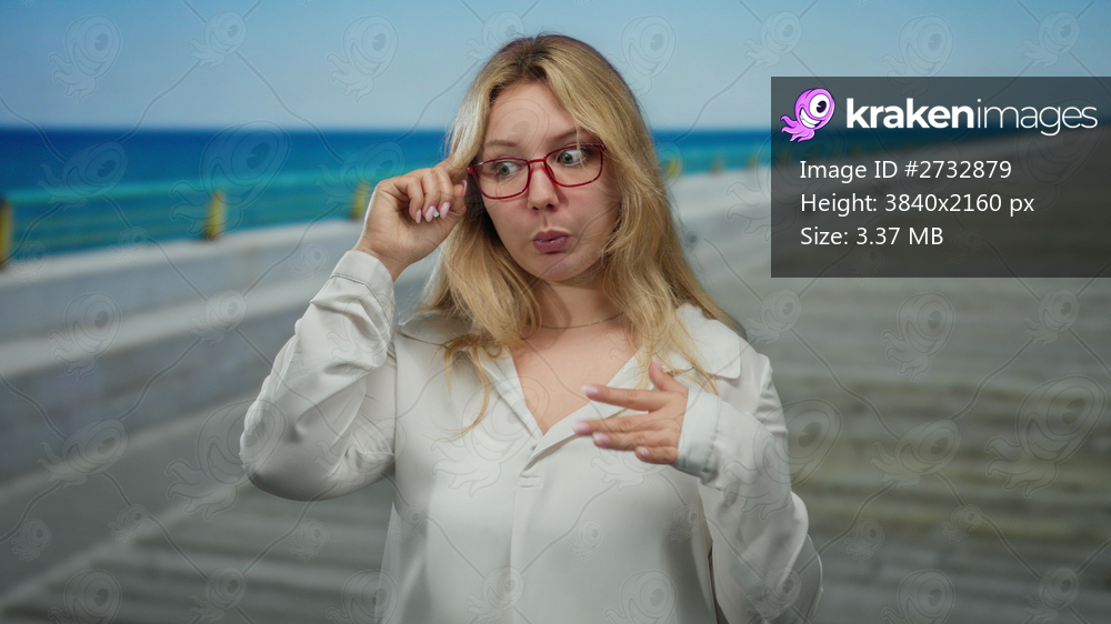 Woman with blonde hair and glasses making playful gestures on a sunny promenade by the blue sea, wearing white, evoking a relaxed and joyful seaside atmosphere. - Kraken Images