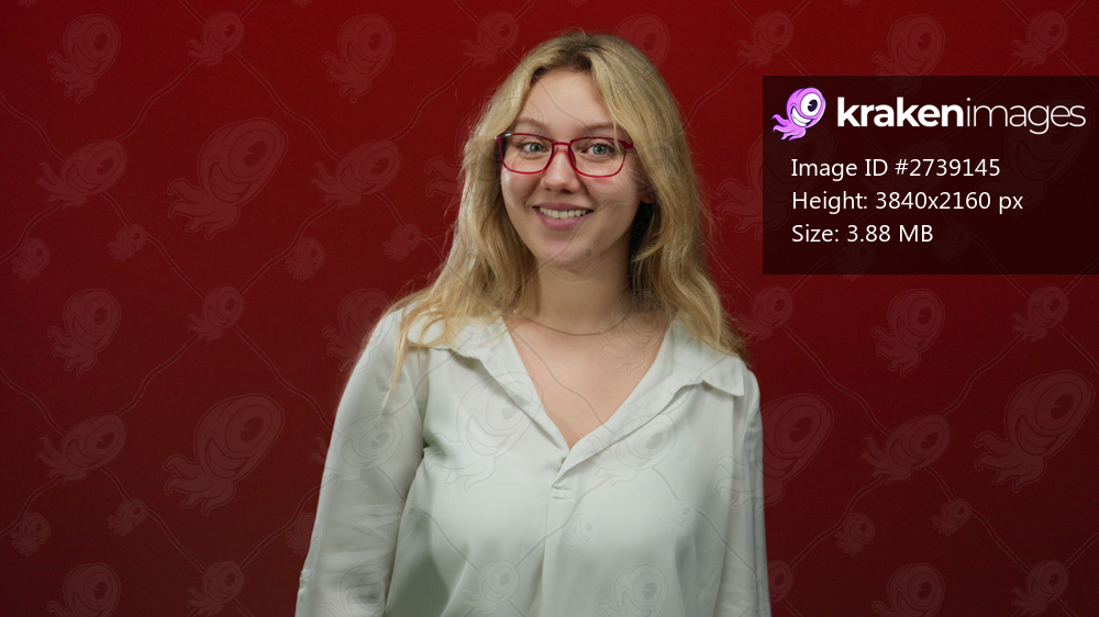 Woman with blonde hair and glasses standing against a vibrant red background, displaying various facial expressions in isolated studio setting.