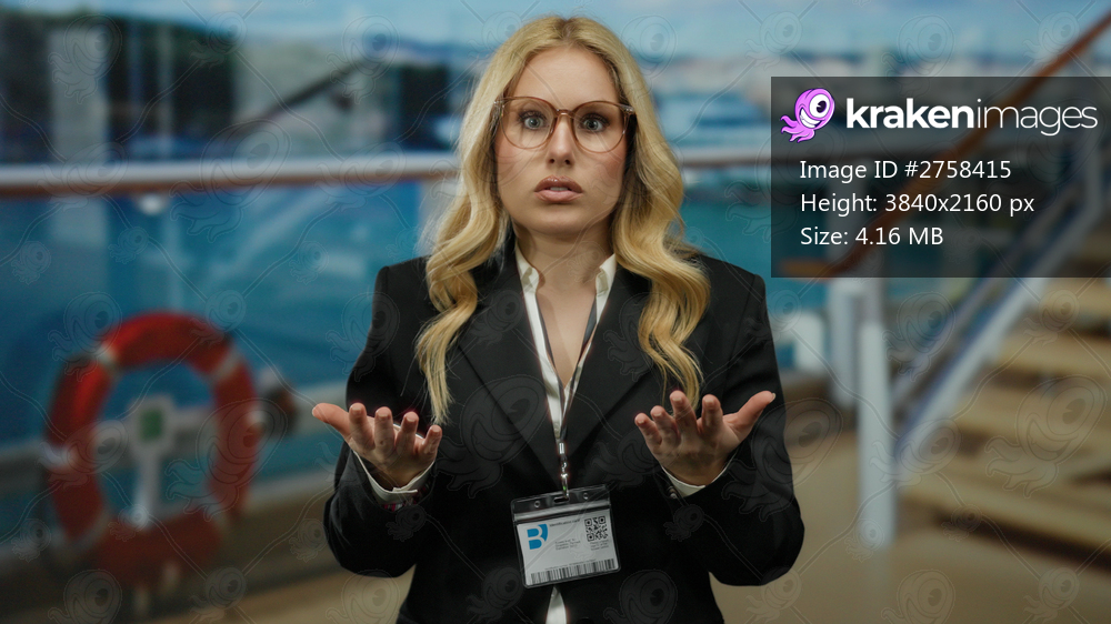 Woman with blonde hair and glasses standing on a cruise ship deck wearing a black suit and id badge, looking concerned under a sunny sky.