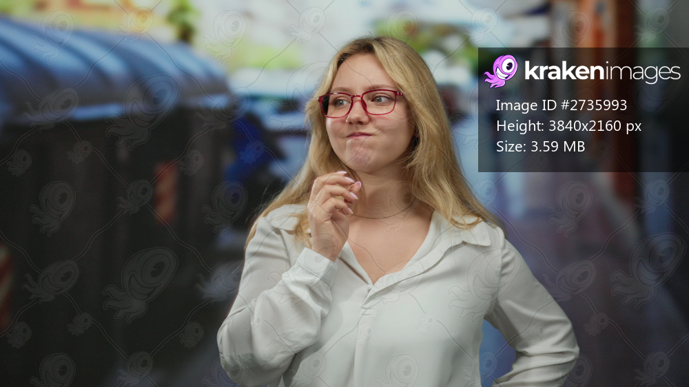 Woman with blonde hair and glasses stands pensively on a city street, wearing a white blouse, suggesting an outdoor urban setting.