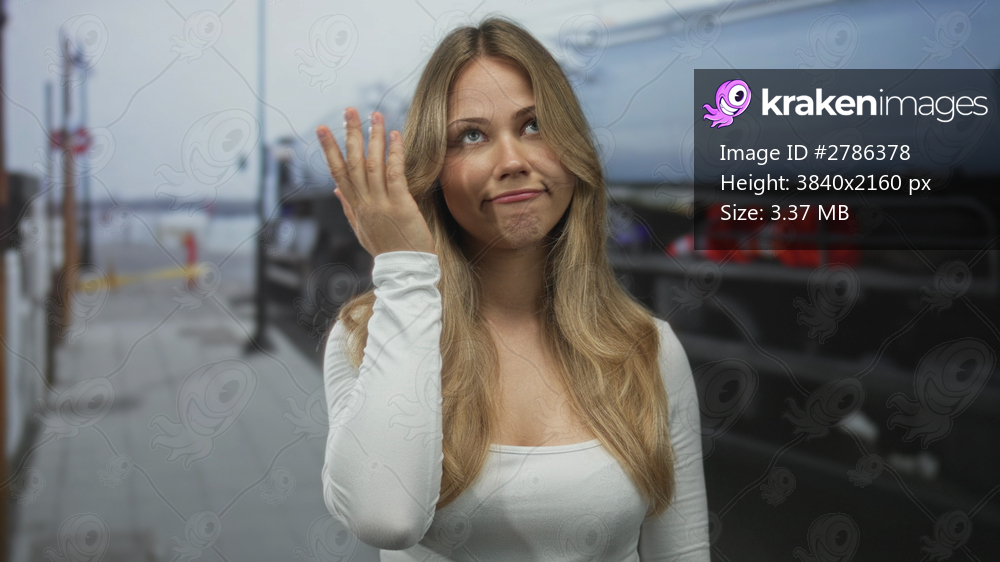 Woman with blonde hair hand covering forehead on urban sidewalk next to parked truck ; exasperation frustration.