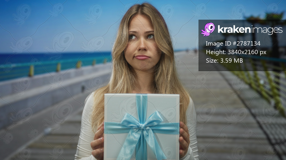 Woman with blonde hair holding a gift box with blue ribbon on a sunny seaside promenade with disappointed expression; sadness disappointment.
