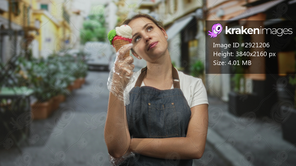 Woman with blonde hair holding a triple scoop ice cream cone on a narrow city street, wearing denim apron and plastic glove with arm crossed; playful summer treat. - Kraken Images