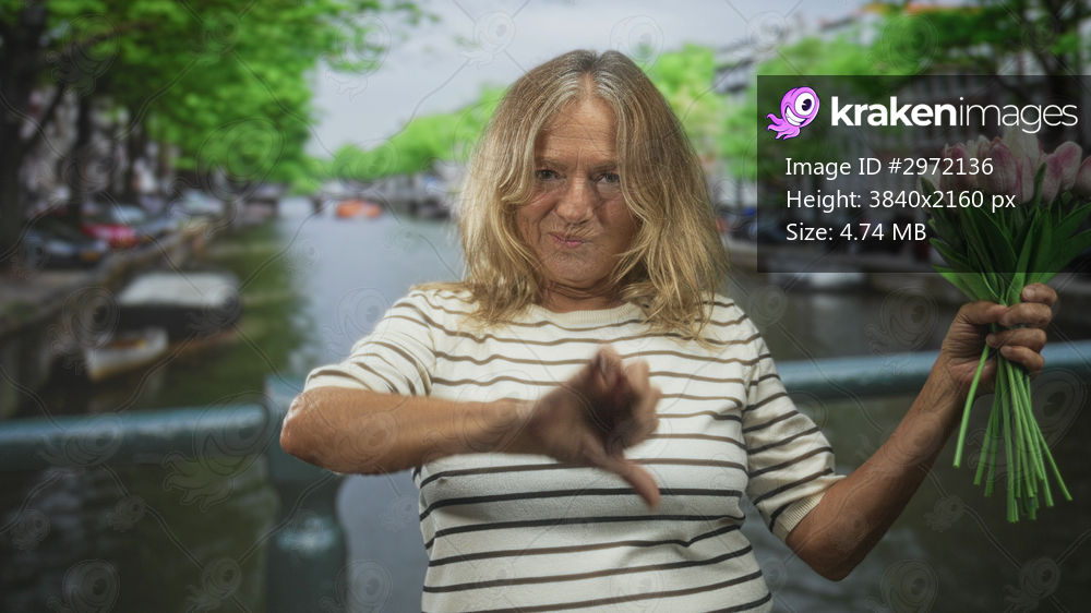 Woman with blonde hair holding a tulip bouquet and showing a thumbs down hand gesture on a street bridge by a canal; playful rejection.