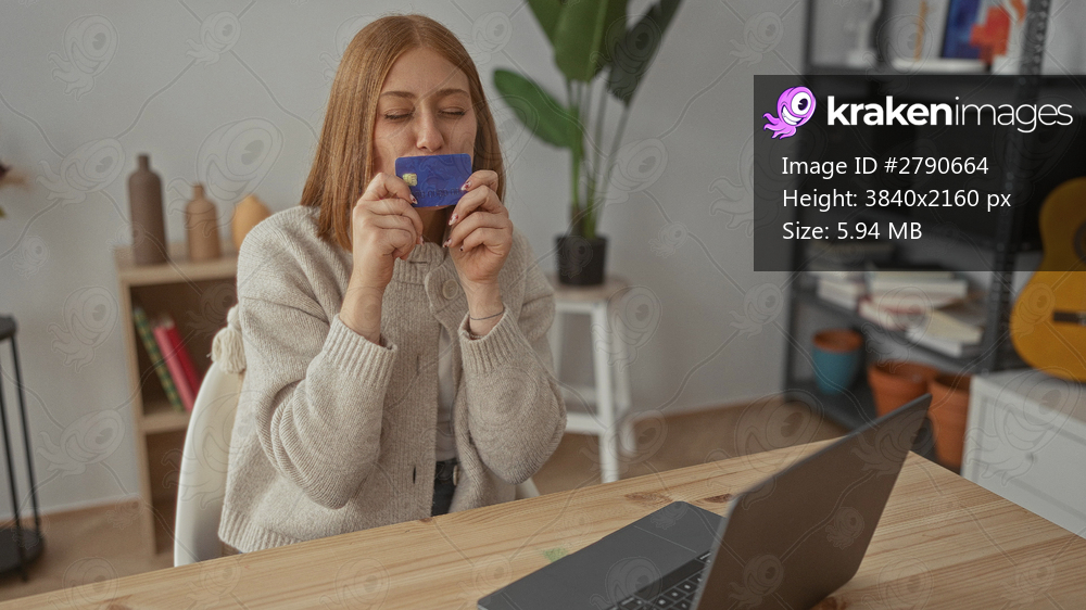 Woman with blonde hair holding credit card and smiling in modern living room with laptop on wooden table, surrounded by shelves and plants creating an inviting home workspace. - Kraken Images