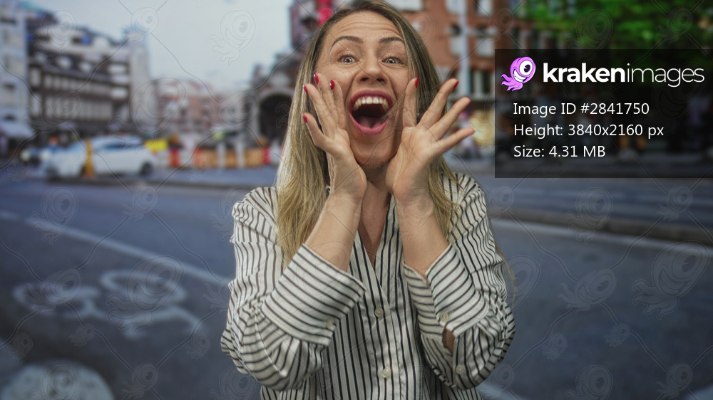 Woman with blonde hair holding hands to cheeks and mouth wide open on busy urban street with blurred cars and buildings; surprise.