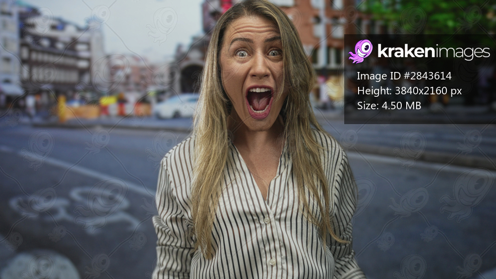Woman with blonde hair holding hands to cheeks and mouth wide open on busy urban street with blurred cars and buildings; surprise.
