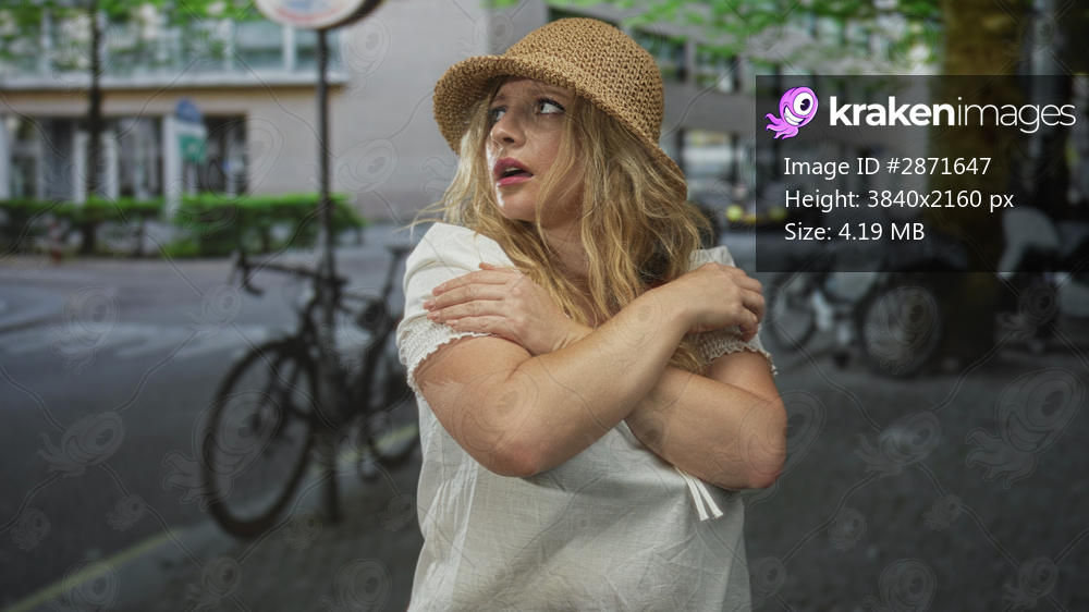Woman with blonde hair holding her shoulders in a self hug on a city street near locked bicycles and parked scooters; anxiety solitude resilience.