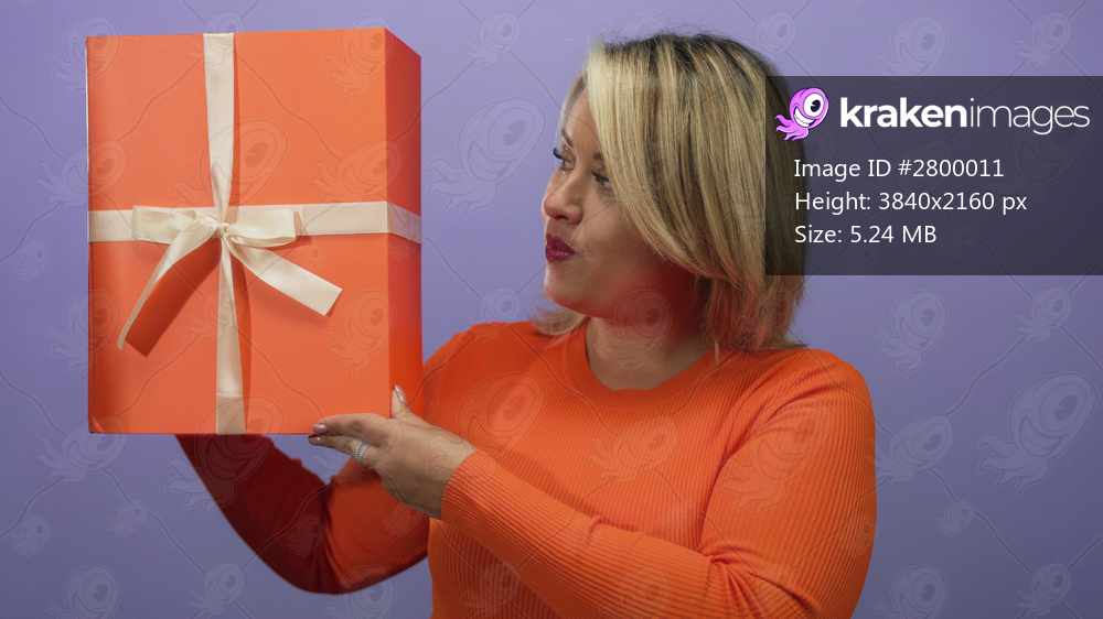 Woman with blonde hair holding large orange gift box with cream ribbon in purple studio; celebration surprise.