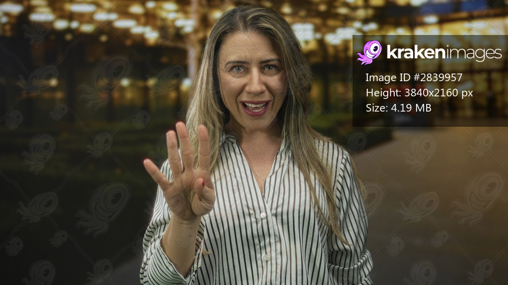Woman with blonde hair holds palm up and smiles on a city street at night presenting a gesture of offering; confidence hope.