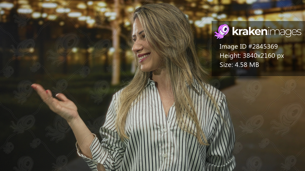 Woman with blonde hair holds palm up and smiles on a city street at night presenting a gesture of offering; confidence hope.
