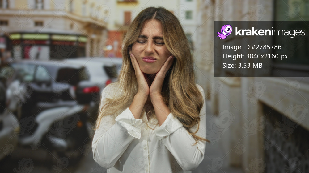 Woman with blonde hair in a white blouse holds her cheek with both hands on a narrow city street; toothache discomfort.