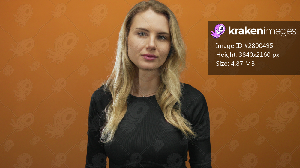 Woman with blonde hair in black shirt standing against a vibrant orange background, looking directly at camera with confident expression, isolated and poised. - Kraken Images
