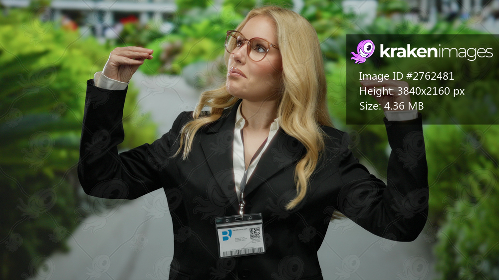 Woman with blonde hair in black suit expressive near id badge in a lush green park with trees.