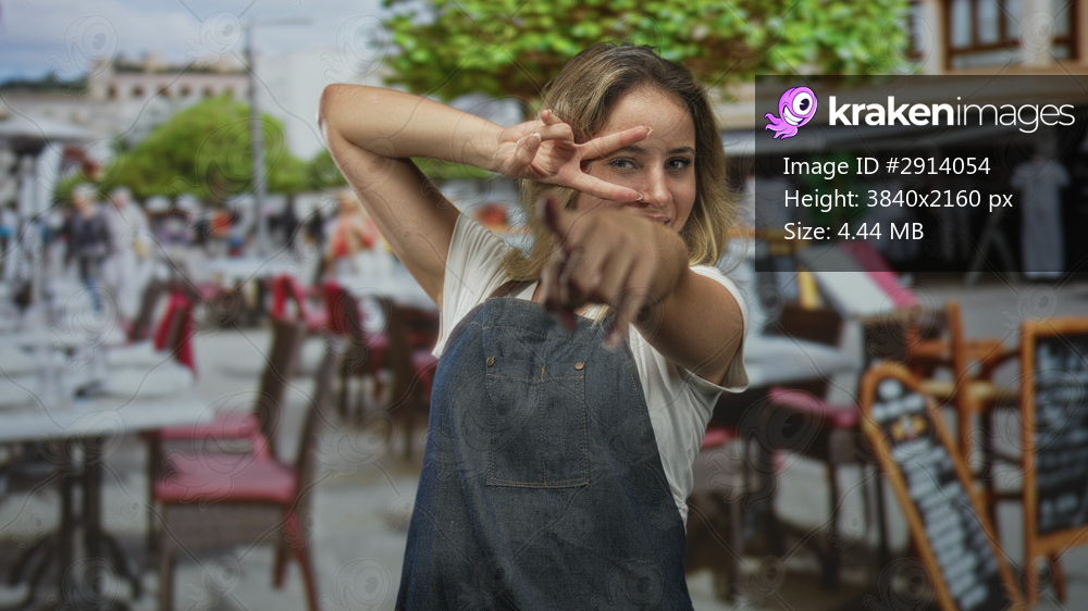 Woman with blonde hair in denim apron points finger to camera and makes peace sign near outdoor restaurant tables on street terrace; playful joy.