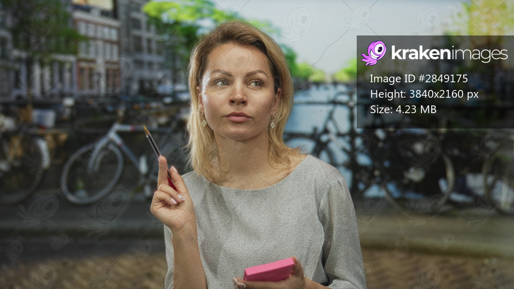 Woman with blonde hair in gray blouse holding pen writing on pink notepad on street; calm reflection planning.