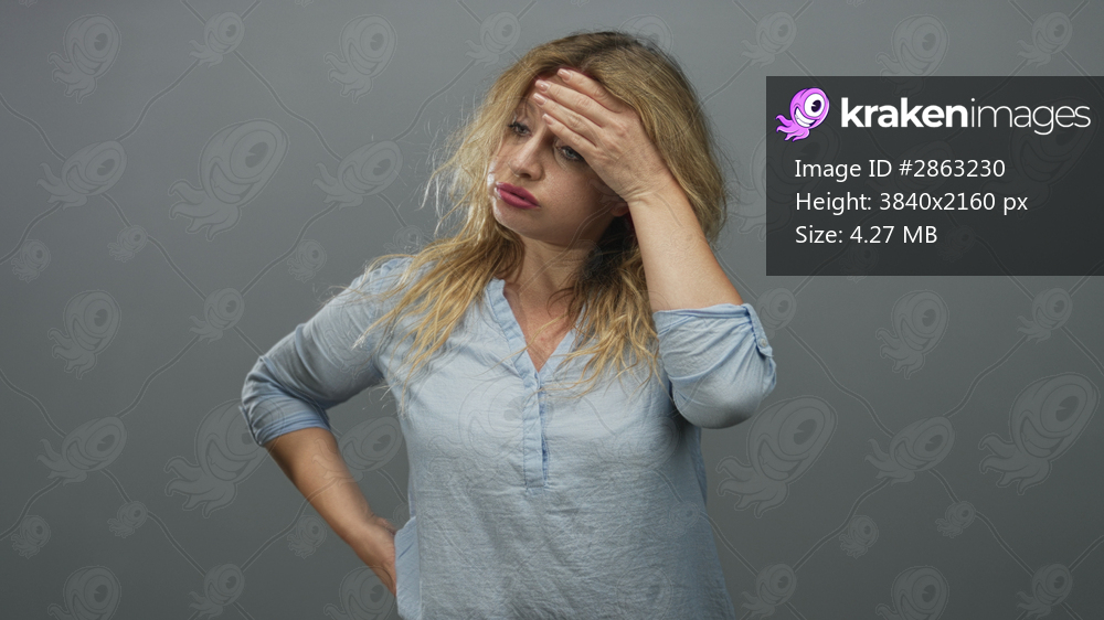 Woman with blonde hair in light blue shirt holding hand to forehead suffering headache in gray studio; fatigue.