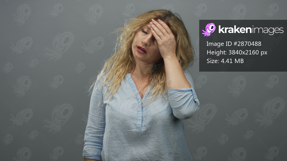 Woman with blonde hair in light blue shirt holding hand to forehead suffering headache in gray studio; fatigue.