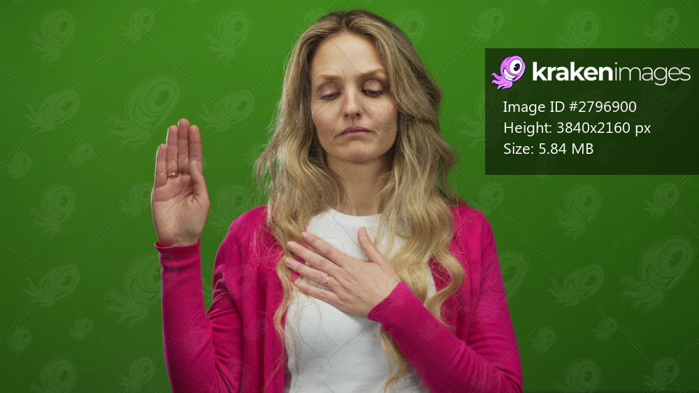 Woman with blonde hair in pink sweater making a pledge gesture over green isolated background setting an earnest tone.