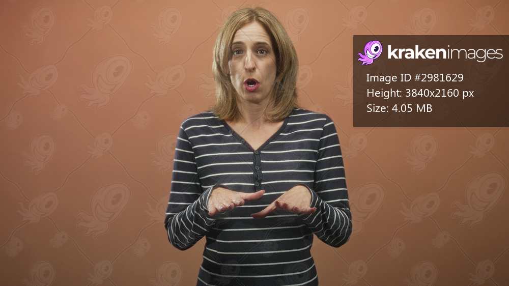 Woman with blonde hair in striped top, hands flat palms down signing with open mouth in studio; explanatory communication clarity.