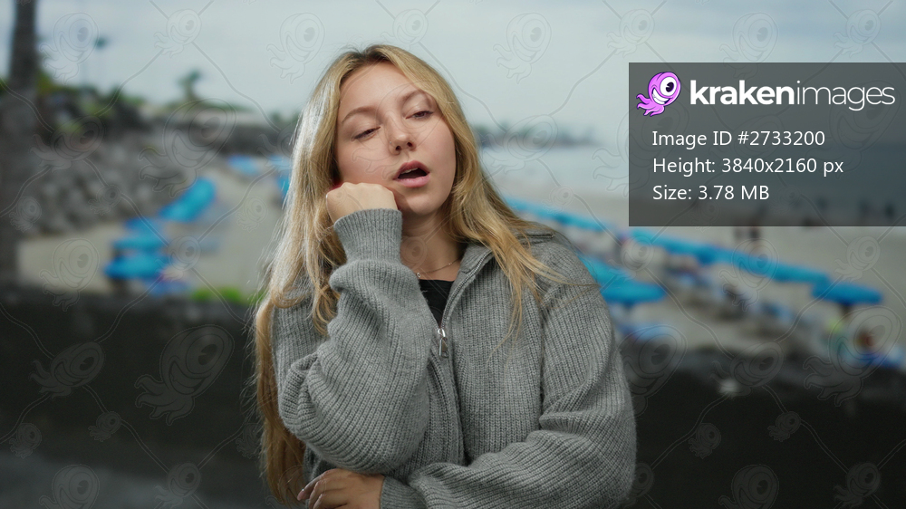 Woman with blonde hair in thoughtful pose at the seaside, standing near a beach with blue umbrellas under a cloudy sky, dressed in a casual gray sweater. - Kraken Images
