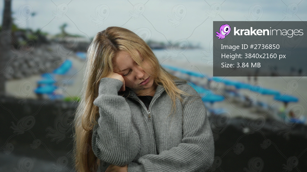 Woman with blonde hair in thoughtful pose at the seaside, standing near a beach with blue umbrellas under a cloudy sky, dressed in a casual gray sweater. - Kraken Images