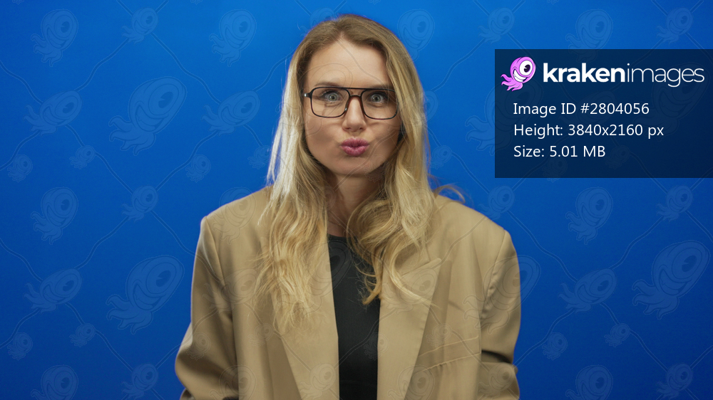 Woman with blonde hair makes a playful face wearing glasses and a beige jacket, standing against a blue isolated background.