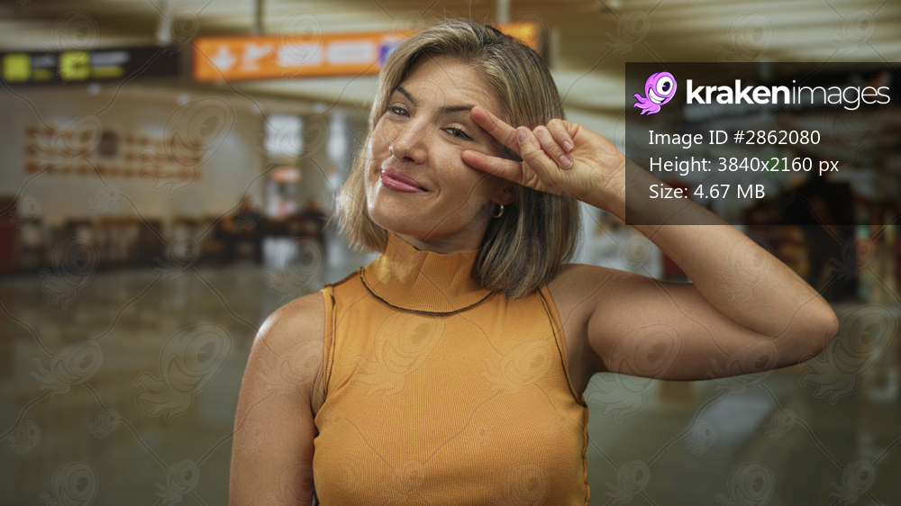 Woman with blonde hair makes victory sign in a brightly lit airport terminal departure lounge near gate c; playfulness.
