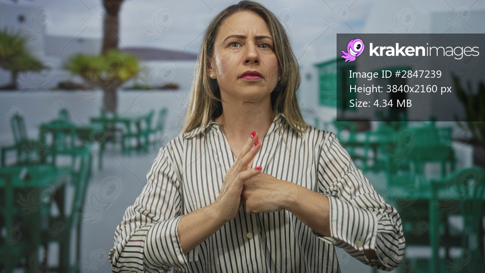 Woman with blonde hair making a tense palm to palm gesture in a green building patio with white walls and green chairs; anger.