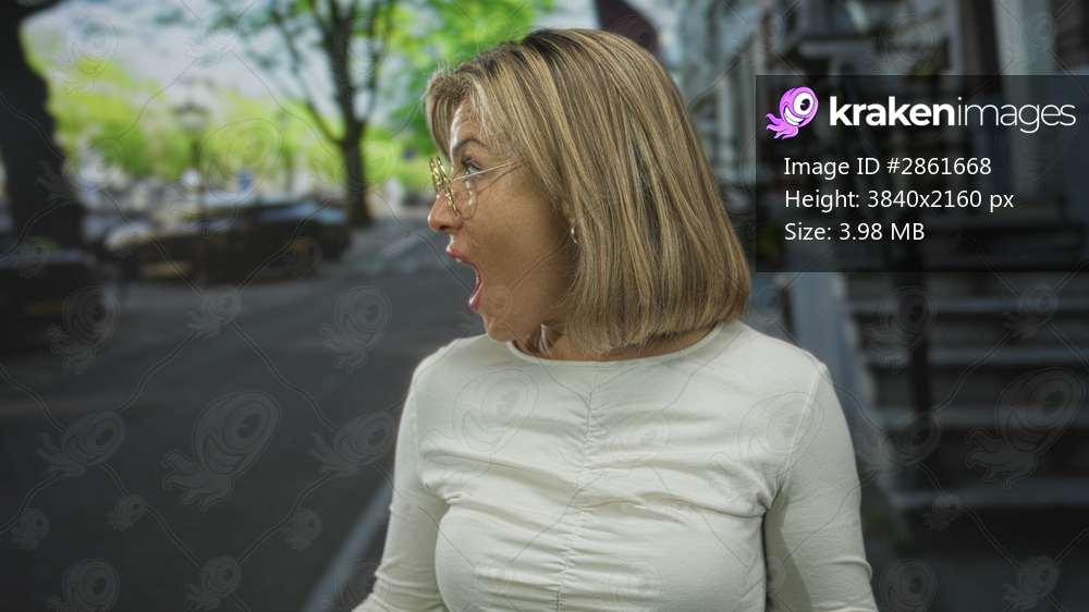 Woman with blonde hair and mouth open gasping with raised palms on urban street amid parked cars; astonishment.