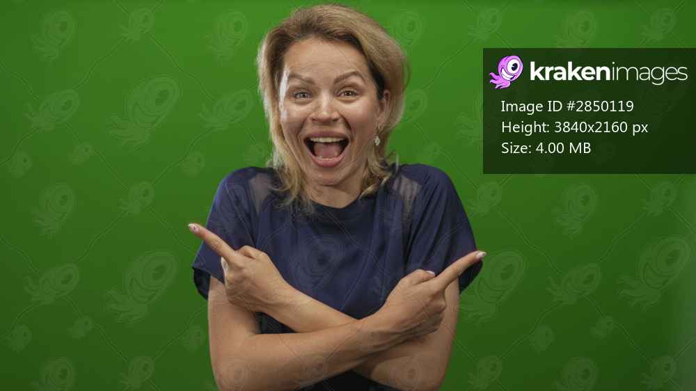 Woman with blonde hair pointing finger in green studio with crossed arms and a joyful expression; excitement.