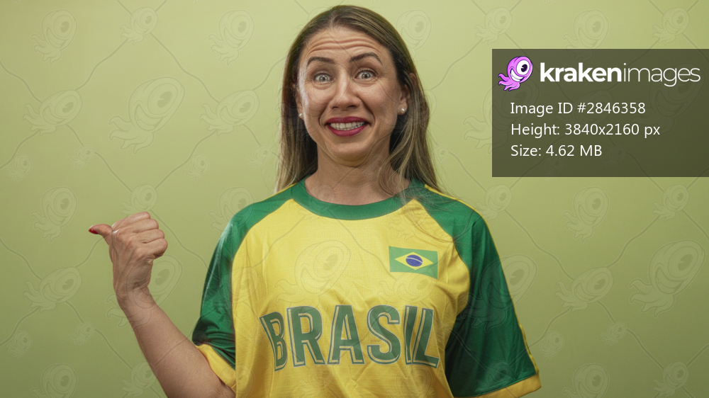 Woman with blonde hair pointing thumb to side in light green studio wearing brazil jersey; confidence.