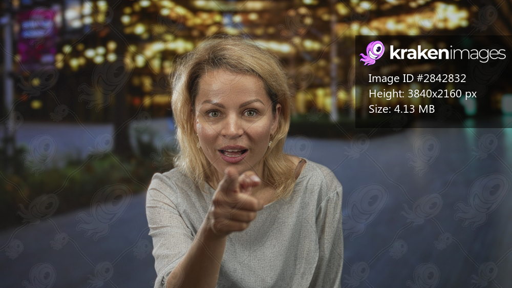 Woman with blonde hair points finger at viewer amid glowing city lights on street at night; accusation.