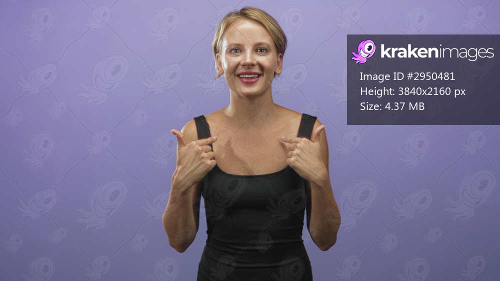 Woman with blonde hair points thumbs to her chest and gestures with open hands in studio with purple backdrop while speaking, wearing black sleeveless top; confidence self. - Kraken Images