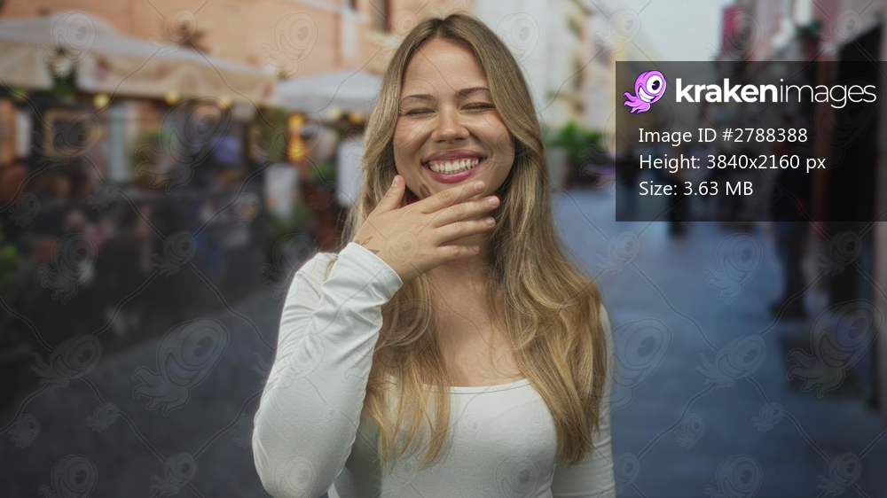 Woman with blonde hair raising hand to forehead on busy city street; curiosity exploration wonder discovery.
