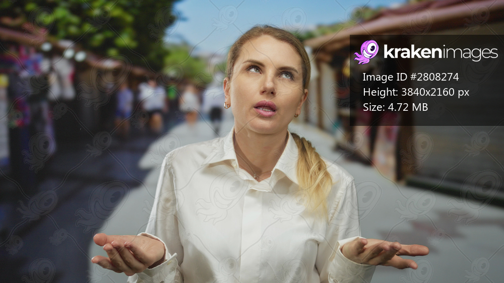 Woman with blonde hair showing disbelief at an outdoor market wearing white shirt in a city setting portrays emotion and urban shopping scene.