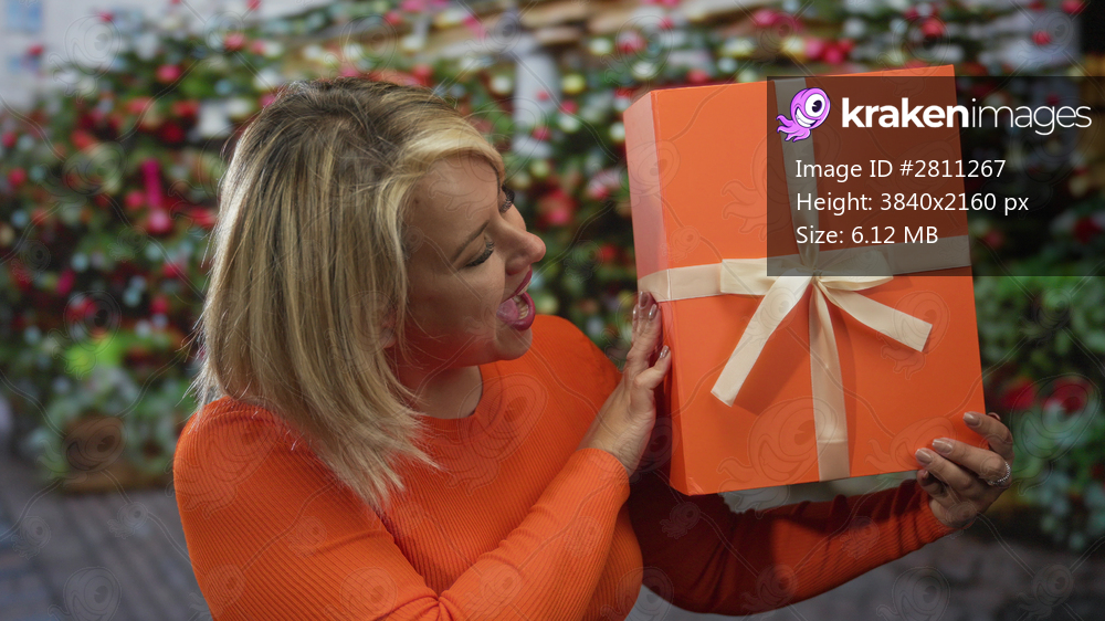 Woman with blonde hair smiles while holding large orange gift box on street decorated with festive lights; holiday joy celebration.