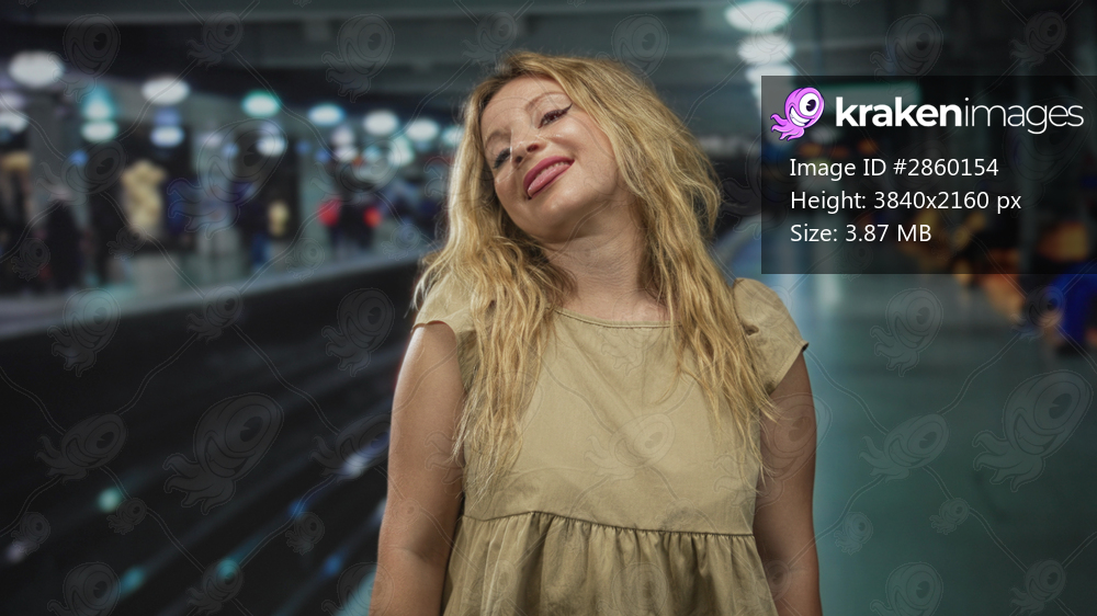 Woman with blonde hair smiling with a gentle head tilt and exposed shoulder on a crowded train platform inside a public building; quiet joy ease.