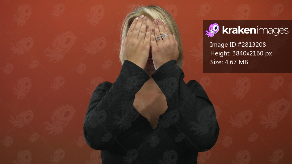 Woman with blonde hair smiling and raising hands with open palms in studio with orange backdrop; playfulness.