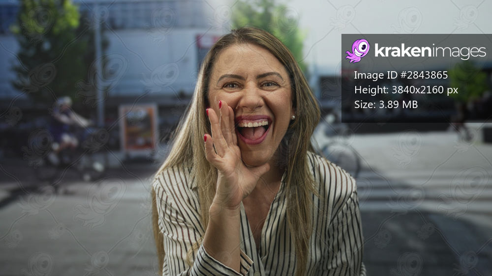 Woman with blonde hair smiling widely and pointing finger towards viewer on sunlit city street; excitement attention.