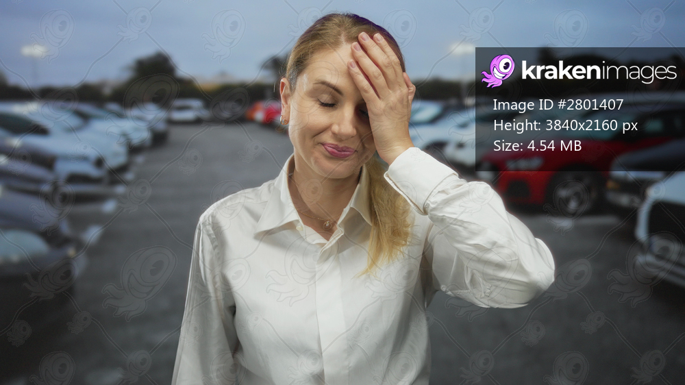 Woman with blonde hair stands in a parking lot outdoors, looking tired near parked cars, wearing white shirt, expressing fatigue and emotion under evening sky. - Kraken Images