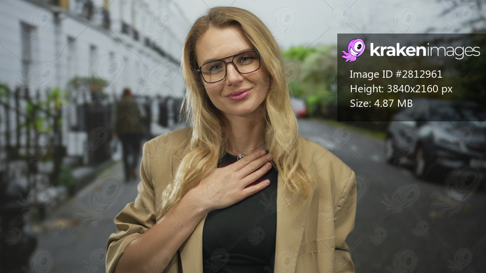 Woman with blonde hair stands on city street smiling in casual clothing with hand on chest, expressing gratitude in an urban outdoor setting with parked cars and greenery. - Kraken Images