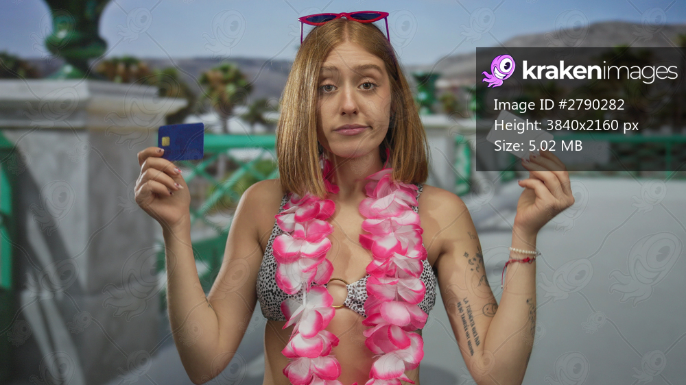 Woman with blonde hair and sunglasses comparing two credit cards while smiling on an urban street in a sunny outdoor setting with a relaxed, summery vibe. - Kraken Images