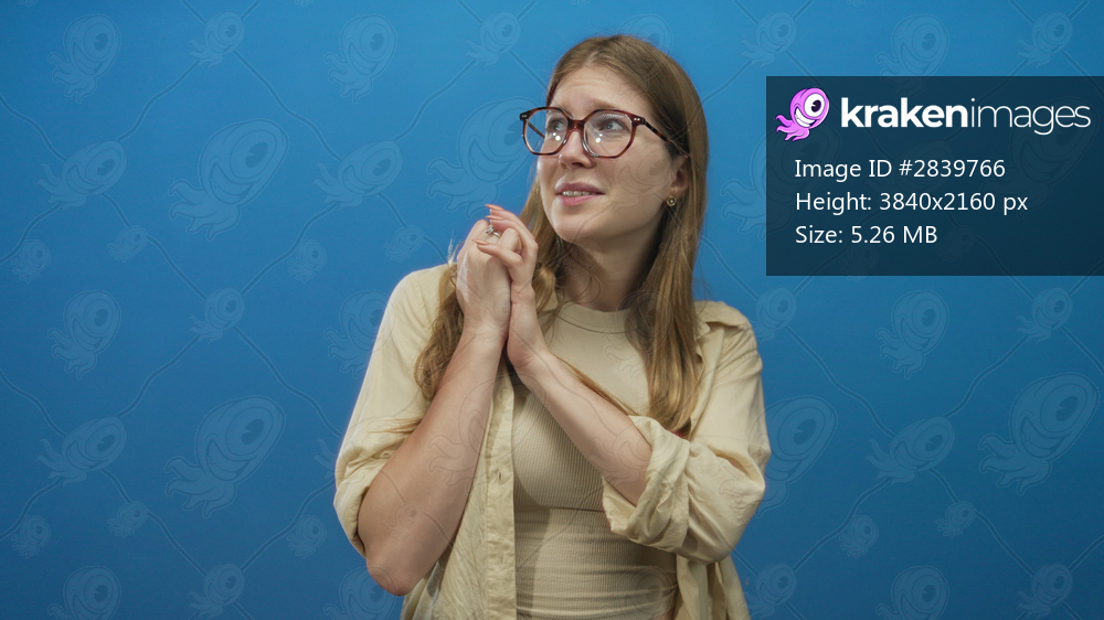 Woman with blonde hair touches her chest with interlaced fingers while gazing upward in a blue studio setting; anxiety.